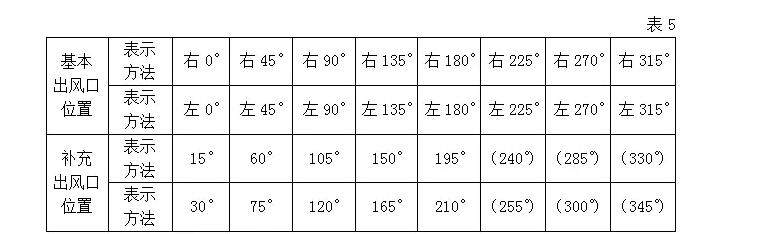 分進風口與出風口兩種,按葉輪旋轉方向區(qū)別,右(左)出風口角度/進風口角度?;境鲲L口位置為八個,特殊用途可增加補充其表示方法和原有代號見表(5)、基本進風口位置為五個:0°、45°、90°、135°、180°,特殊用途例外,若不裝進氣室的風機,則進風口位置可不予表示,風口位置的寫法是:右(左)出風口角度。